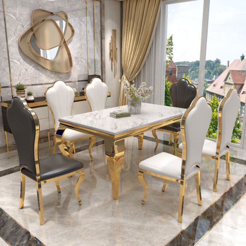 La table de salle à manger de luxe de marbre de rectangle d'acier inoxydable a placé des chaises de salle à manger